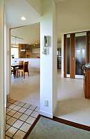 | リビングとキッチンのドアの高さに 注目。サッシメーカーならではの 2m30 pの建具。天井の低い日 本の家もドア高を高くすることで 圧迫感をなくすことが出来ます。 |