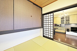 | 洋と和を間仕切る建具は組子障子戸を採用。 上がり畳の床下はもちろん収納たっぷり可能です。 リビング側にはモダンな木目面材の引出を造作して入替えました。 |