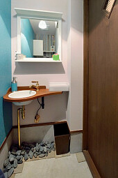 | ブルーを基調にした御手洗。 店内同様アンティーク調のアクセントクロスと、真鍮色の金物で、温かみのある空間になっています。 |